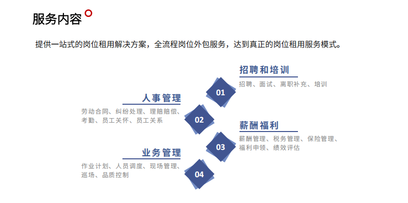 元海通过岗位外包的形式,为客户提供全面、专业的弹性用工解决方案,帮助企业剥离非核心岗位或非核心业务流程,专注核心业务,从而优化企业内部资源配置,提高核心竞争力,实现企业运营效用最大化。